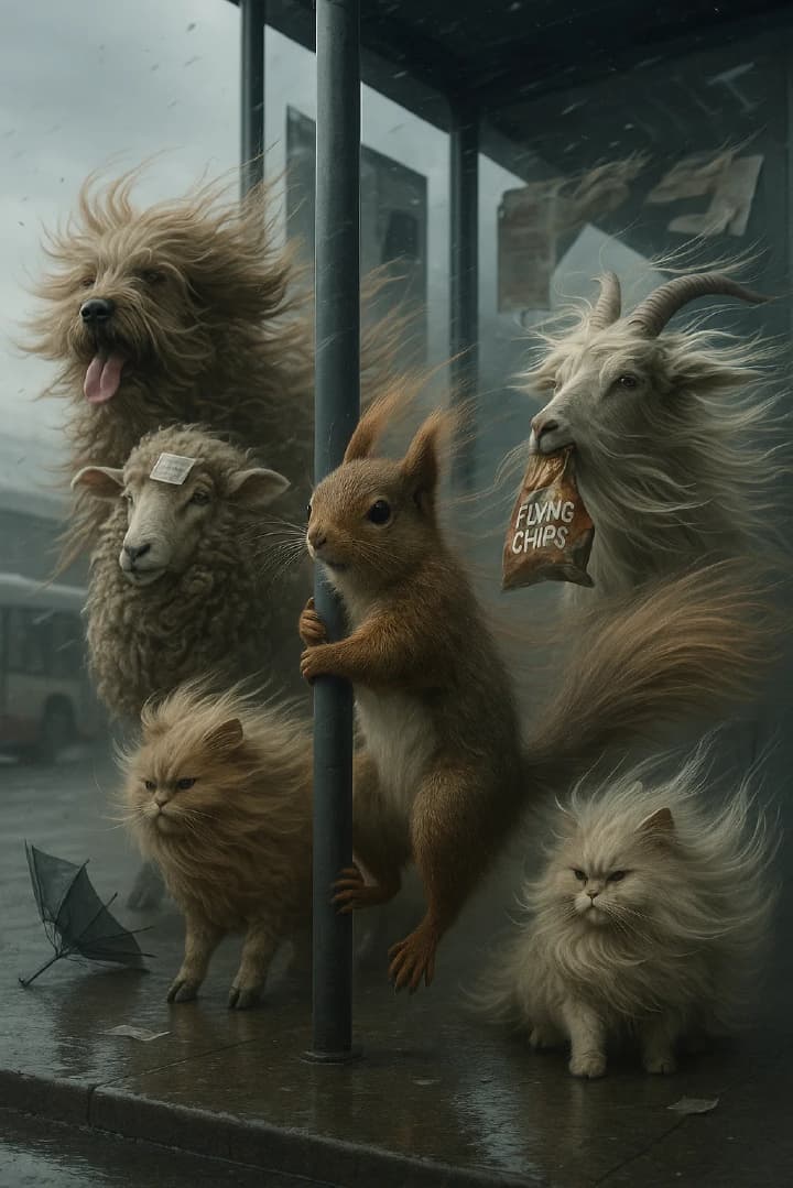 A hyper-realistic cinematic 9:16 vertical shot of five long-haired animals standing in a violent windstorm at a city bus stop, parody of an epic movie moment. Each animal has long flowing hair and perfect anatomy, their fur whipped horizontally by extreme gusts of wind. The central figure is a squirrel with extra-fluffy fur, gripping a metal pole with both paws, body leaning forward against the airflow, tail extended backward in motion blur, every hair strand defined. To its left stands a shaggy dog with thick layered fur flying in all directions, tongue stretched sideways, eyes half-closed as the wind bends its long ears. Behind it, a sheep with dense curly wool rippling like ocean waves, ticket stuck naturally to its forehead, legs braced firmly for balance. On the right, a Persian cat crouches low, luxurious fur streaming behind like a veil, umbrella turned inside out beside it. Next to her, a mountain goat with long silky hair bites onto a flying chips bag, strands of mane and beard lifting dramatically in the storm.