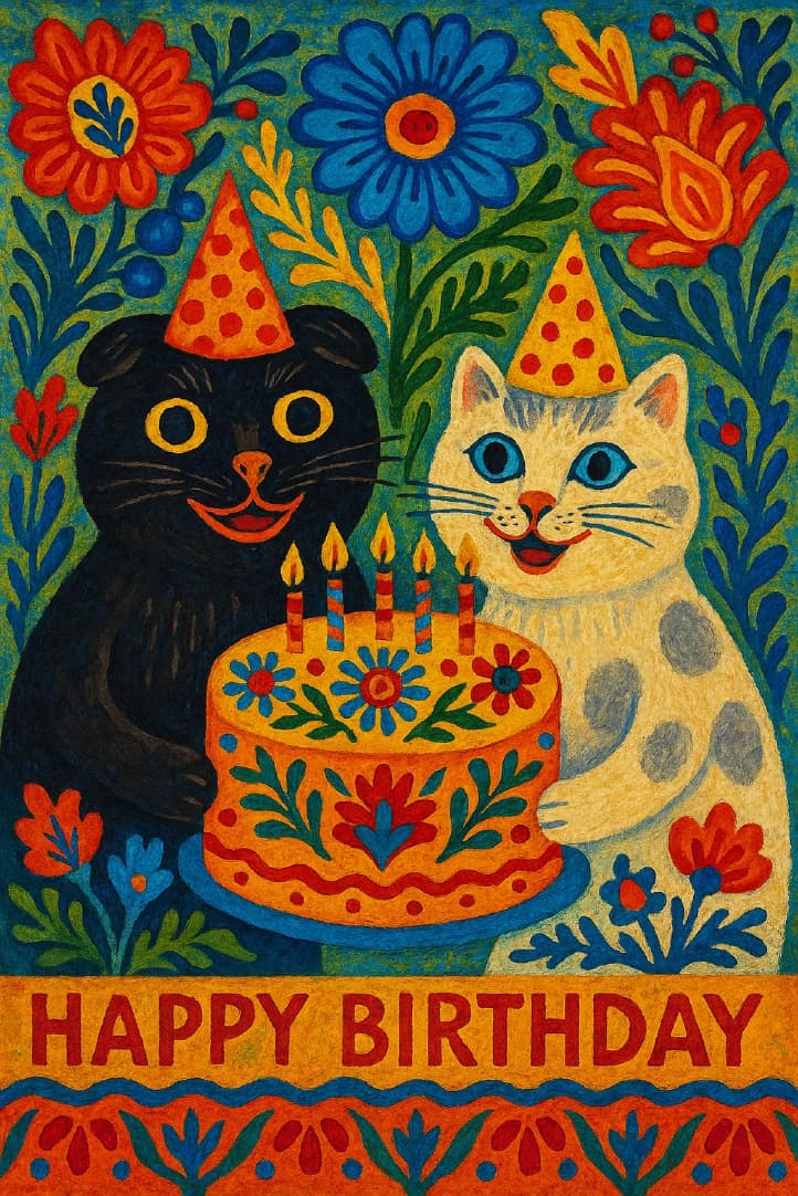 A whimsical, colorful birthday card illustration in the style of Ukrainian folk artist Mariia Prymachenko. Two joyful cats are the focus: one is a black scottish fold, the other is a white cat with soft gray spots. They are smiling and presenting a bright, patterned birthday cake with candles. The scene is surrounded by fantastical flowers, bold folk patterns, and vibrant natural motifs — in the expressive, imaginative style of Prymachenko’s paintings. The composition should be richly detailed, with vivid colors, decorative textures, and a hand-painted folk-art feel.