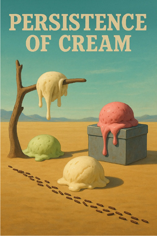 Surreal desert plain; pocket watches replaced by melting ice-cream scoops Creative Added on: Oct 22, 2025 Description